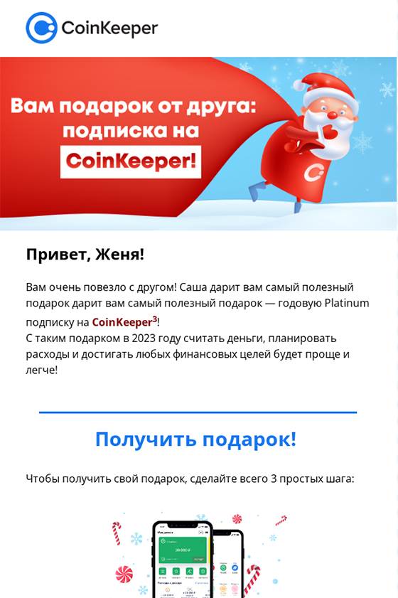 Сразу после оплаты ваш друг получит яркое поздравительное письмо, где найдёт подробную информацию о подарке, данные для входа в аккаунт и узнает имя дарителя.